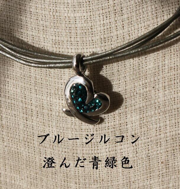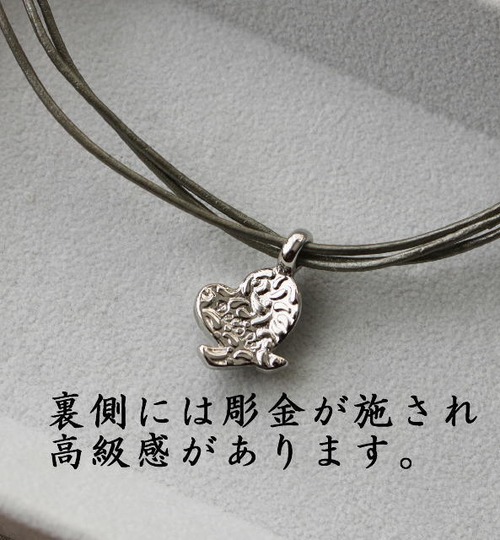 ちょっと斜めになったハート型に小さな粒の石を敷きつめ 細い革紐(日本製)を3本束ねたオリジナルのヒモに通しました。 カンが大きいので、お手持ちのチェーンやリボンに付けかえても使えます。 金具は銀色のみ。 革紐40cm+アジャスター5cm